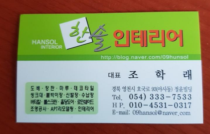 이 글은, 나의 경험담을 기록한 내용이기도 하지만... 혹여라도, 영천에 거주하면서 집수리(리모델링 공사)가 필요하다면, 한솔인테리어 적극 추천한다. 영천에서 인테리어 전문업체를 찾는다면, 참고가 되었으면 좋겠다. 아래, 한솔인테리어 사장님 명함을 올려두니 필요한 이들은 연락처 참고하면 된다.
