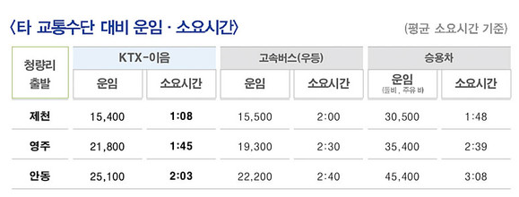 일반실 운임은 청량리〜안동 2만5천100원, 영주 2만1천800원, 제천 1만5천400원이다. 우등 고속버스와 비슷한 수준이다. 우등실 가격은 청량리〜안동 3만100원, 영주 2만6천200원, 제천 1만8천500원이다. 기존 KTX의 특실에 해당하는 우등실 요금은 일반실 운임의 20%로 설정해 기존 특실 가격보다 저렴하게 이용할 수 있다.