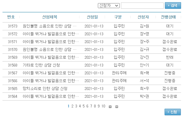 층간소음 이웃사이센터 상담신청 게시판 현황 : 2021년 1월 13일 기준