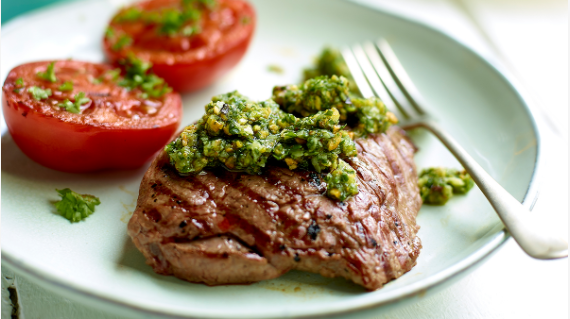 5) 각 스테이크에 작은 숟가락의 페스토를 올리고 나머지 페스토는 따로 제공합니다. 반으로 자른 구운 토마토와 찐 감자 또는 신선한 파스타와 함께 제공합니다.