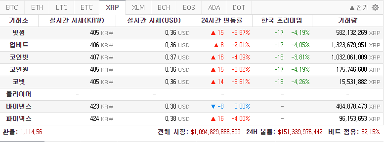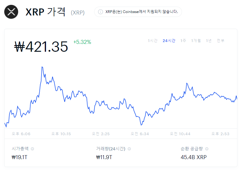 오늘자 코인베이스 거래소의 리플 (XRP) 가격은 421.35원을 기록중입니다. 물론, 이런 가상화폐 시세들의 경우 사용자가 확인하는 시간을 기준으로 실시간으로 변동이 되니, 정확한 가격을 확인하고 싶으시면 주로 거래하는 사이트의 거래소 시세를 살펴보는게 제일 정확합니다.
