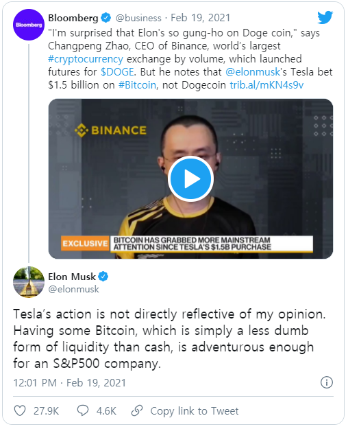 테슬라는 당분간 돈의 일부를 비트 코인에 보관할 계획이라고 밝혔다. 지난주, 머스크는 투자에 대한 비판에 대한 답장으로 테슬라의 구매가 디지털 통화에 대한 그의 개인적인 견해를 반영하지 않았다고 트위터에 올렸습니다.