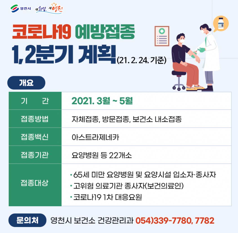 이에 영천시의 경우 아래의 일정으로 예방접종이 실시될 계획이네요. 영천시민분들은 참고하시면 되겠습니다.