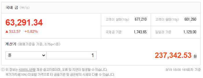어제 날짜 3월 19일 기준으로, 신한은행에서 제공하는 정보로는; 금 한돈 가격 금시세 정보는 237.526.27원 이었네요.