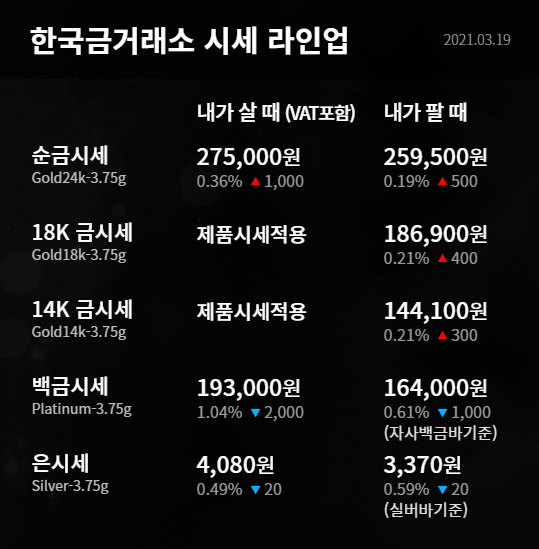오늘의금시세 한국금거래소를 살펴보면 역시나 어제 날짜로 275,000원 이었네요. 지난 2주간 국내 금시세는 꾸준히 상승한 모양새입니다.