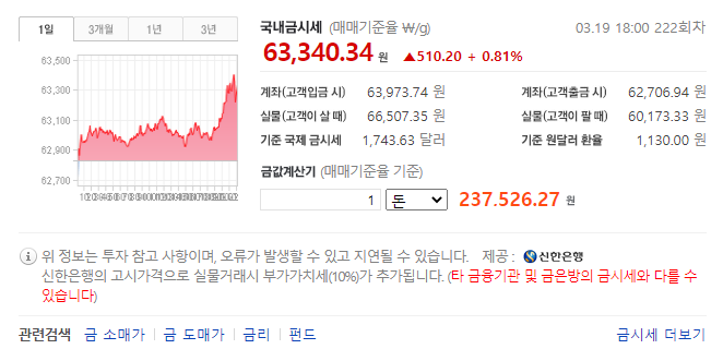 어제 날짜 3월 19일 기준으로, 신한은행에서 제공하는 정보로는; 금 한돈 가격 금시세 정보는 237.526.27원 이었네요.