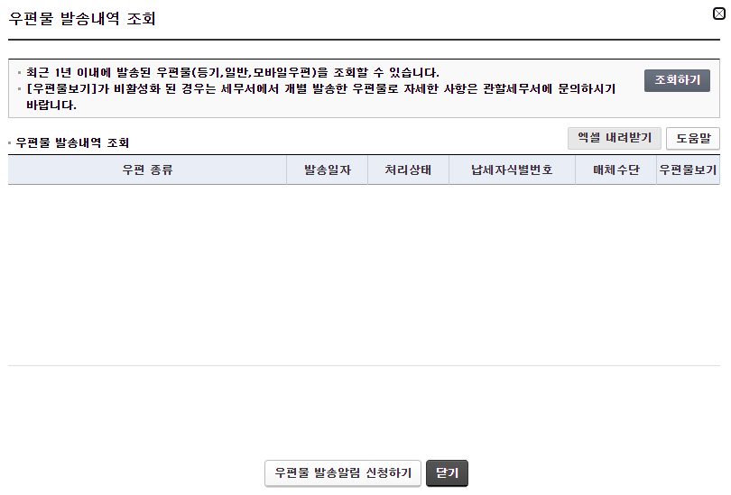 인증 후, 우편물 발송내역 조회 창이 보이는데, 우측 상단에 - 조회하기 버튼을 클릭해야 합니다.