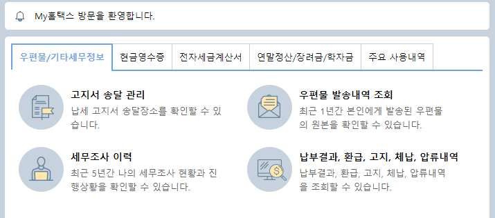 국세청 홈택스 홈페이지 로그인 후 > MY 홈택스 메뉴 클릭(메인 화면 하단에 위치) > 우편물/기타세무정보 메뉴 하단에 있는 - 우편물 발송내역 조회 클릭!