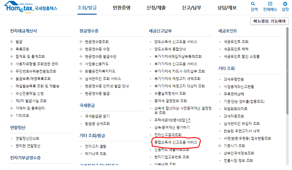 홈택스 상단 메뉴 - 조회/발급 > 세금신고납부 > 종합소득세 신고도움 서비스 클릭!