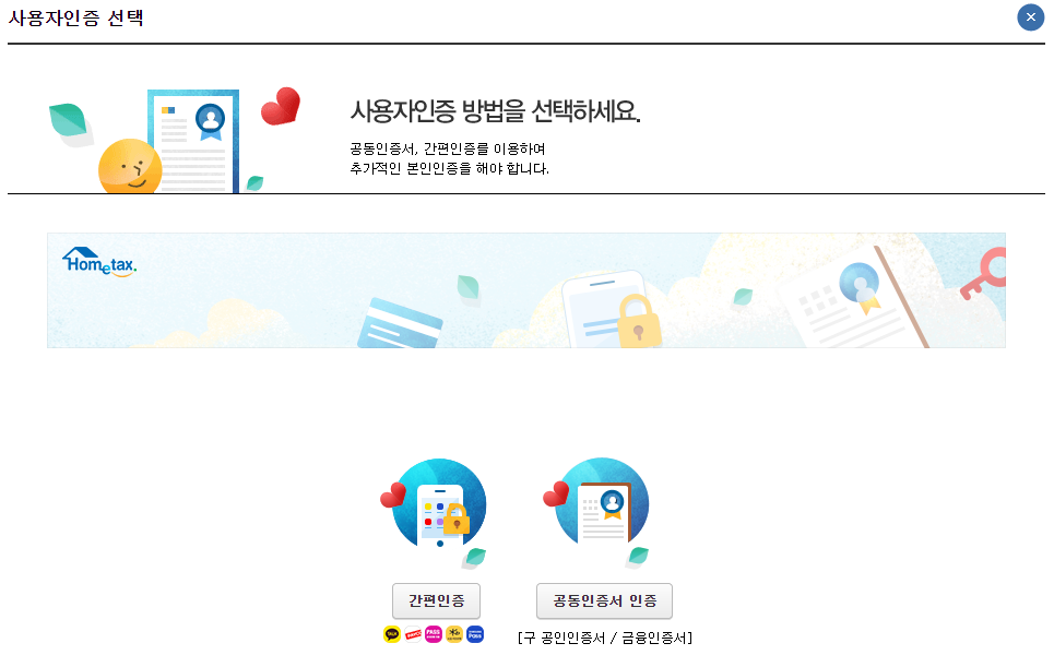 사용자인증 방법은 편한 방법을 선택하면 되며, 기존에 사용중인 공인인증서가 있다면 활용하셔도 됩니다.