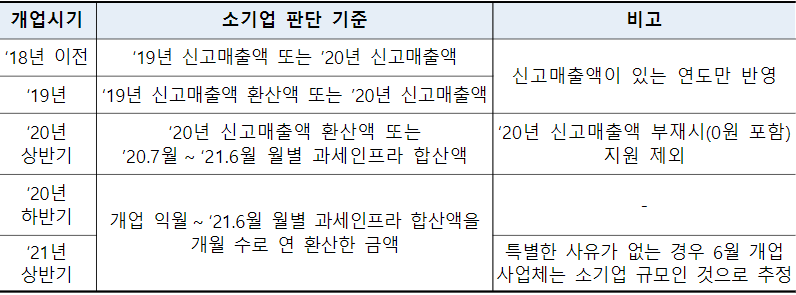 개업시기별로 제시된 매출액 기준중 하나라도 업종별 소기업 기준에 해당하면 소기업으로 판단.
