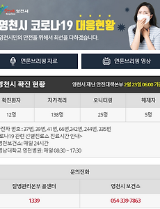 2020/02/241 코로나19 영천시 현황 : 확진환자 12명으로 증가 코로나19 영천시 현황 : 확진환자 12명으로 증가 드디어 영천시의 코로나19 확진환자가 7명에서 12명으로 증가하였네요. 요즘 하루에도 몇 통씩 영천시, 군위군, 경산시청, 경북도에서 코로나19 관련 문자메시지를 아주그냥 폭탄 발송하고 있는 현황입니다. 특히나 영천시에서 발송하는 문자메시지 내용을 보노라면, 일처리의 답답함이 그대로 묻어나는것 같습니다. 영천시 코로나19 확진자 이동경로 부분에 대한 구체적인 내용이 좀 미흡하기도 하거니와, 정보의 속도전에서 너무 느립니다. 확진환자가 몇 명 되지 않았을때에 빠르게 당사자와의 면담을 통해, 이동경로 관련 세부정보를 충분히 얻을 수 있었을텐데, 정보수집 및 공유의 속도가 너무 느린것 같습니다. 시민들의 불만도 커지는 형국이네요. 조금전에 영천시청에서 보낸 .. 2020. 2. 24. 이전 1 다음